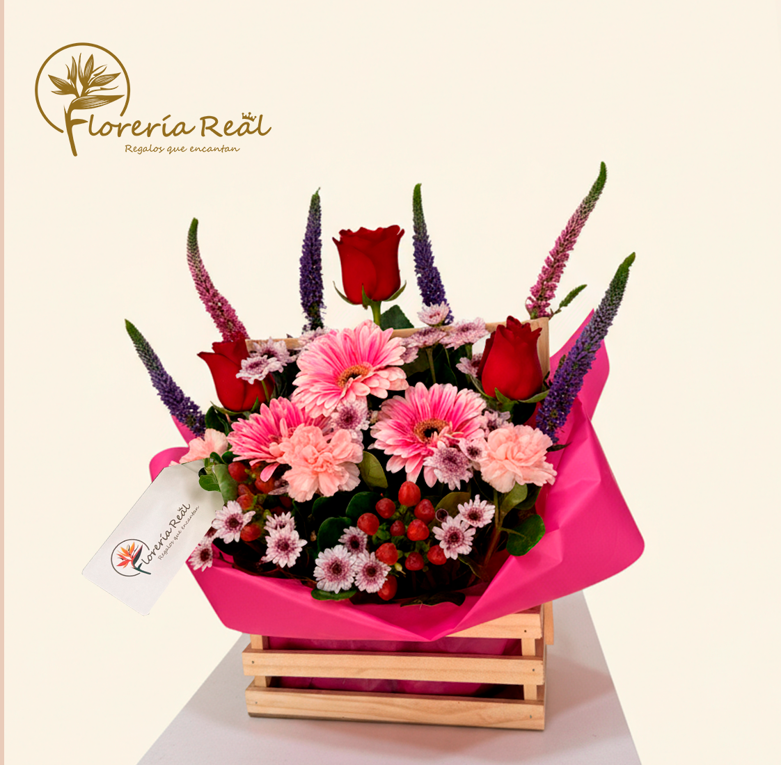 3 rosas con flores rosadas ( acorde a disponibilidad)