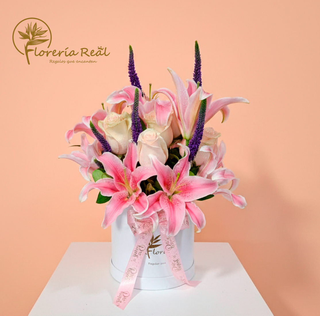 7 flores de lilium,6 rosas y 5 verónicas ( acorde a disponibilidad)