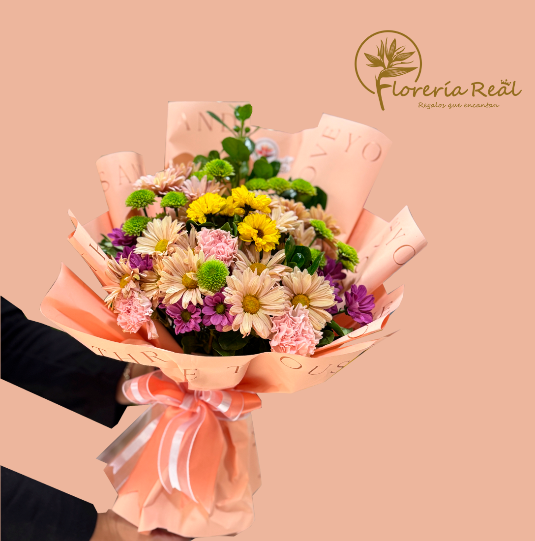 Ramo con diferentes flores de colores en un papel especial adornadas en un ramo con mix de follaje.