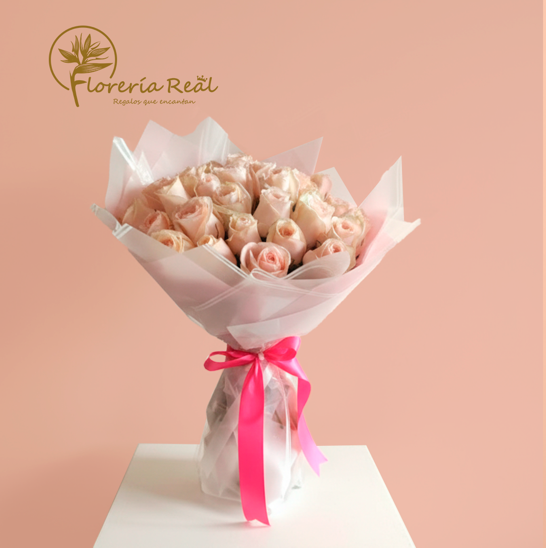 25 rosas rosadas adornadas en un ramo con mix de follaje.