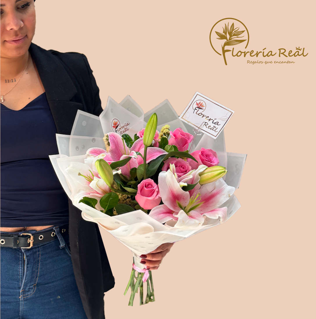 3 lilium + 6 rosas adornadas en un ramo con mix de follaje.